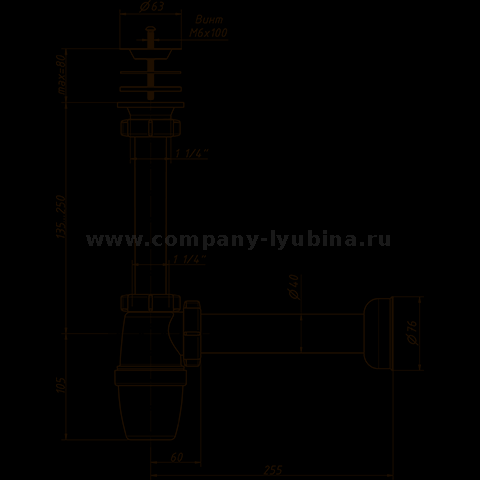 Сифон бутылочный 1 1/4 х 40 мм, малый корпус, с удлинённым патрубком и прямой трубой 40-40 В-32059 ОРИО.